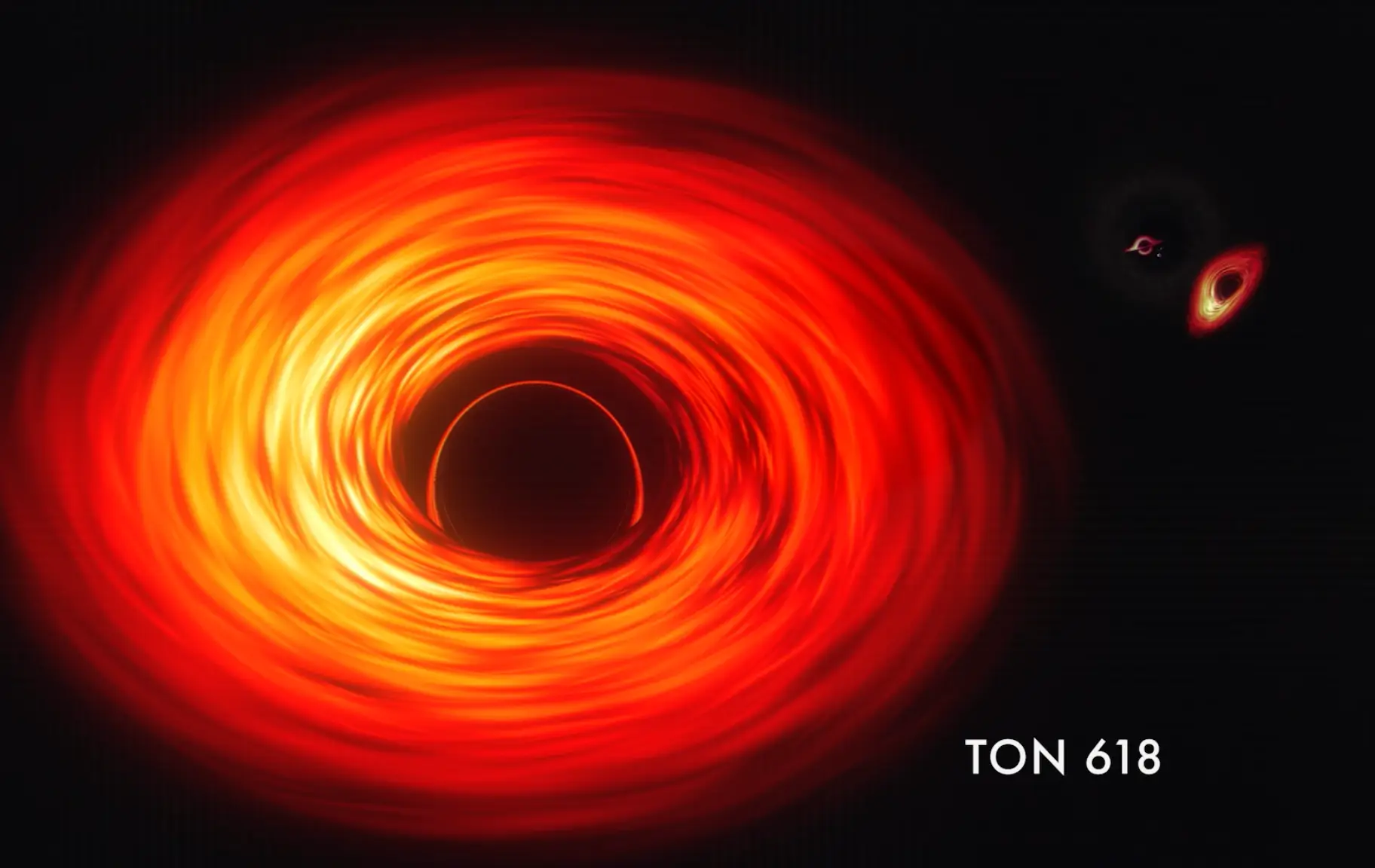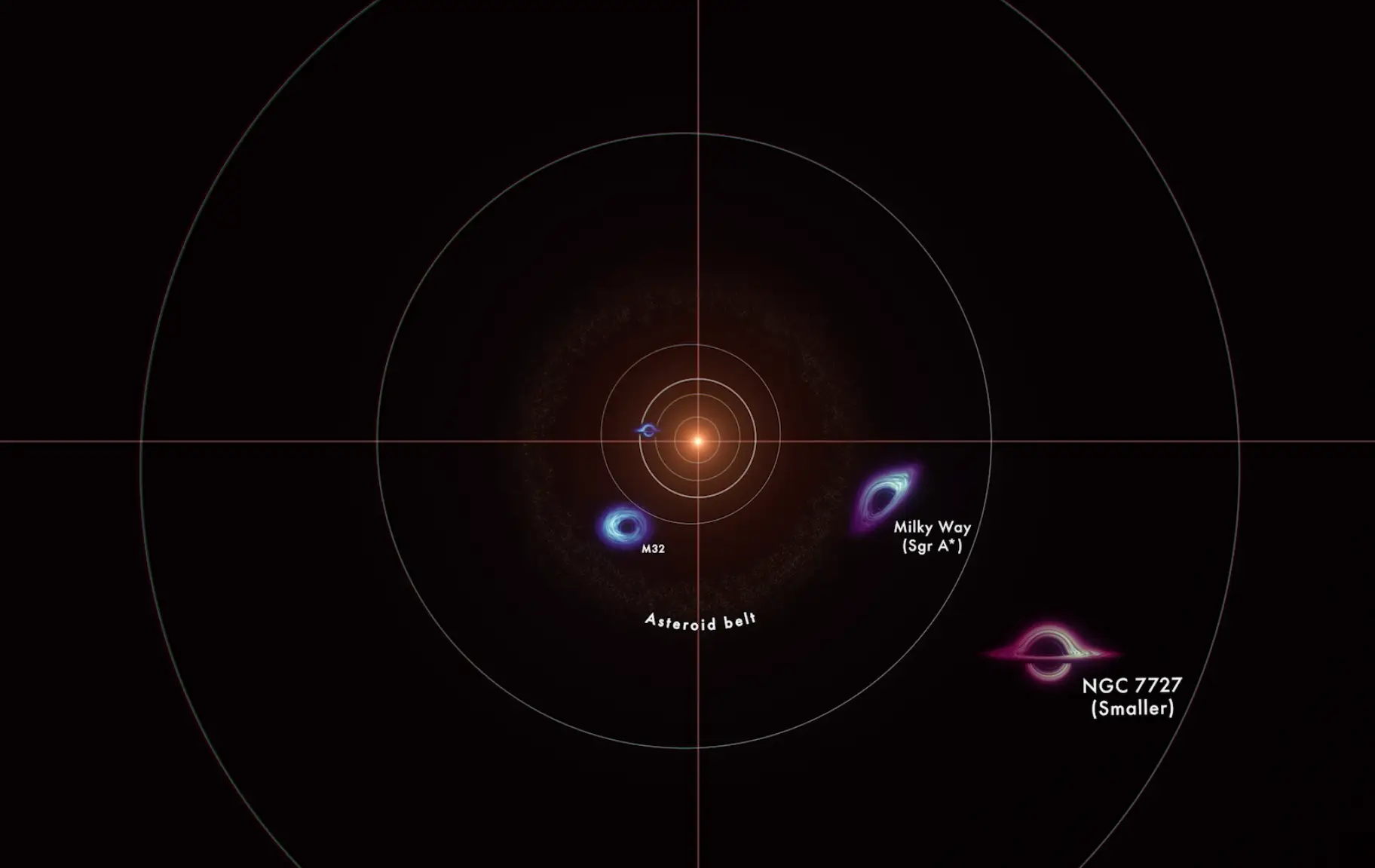 “Smaller black holes are shown in bluish colours because their gas is expected to be hotter than that orbiting larger ones. Scientists think all of these objects shine most intensely in ultraviolet light.”