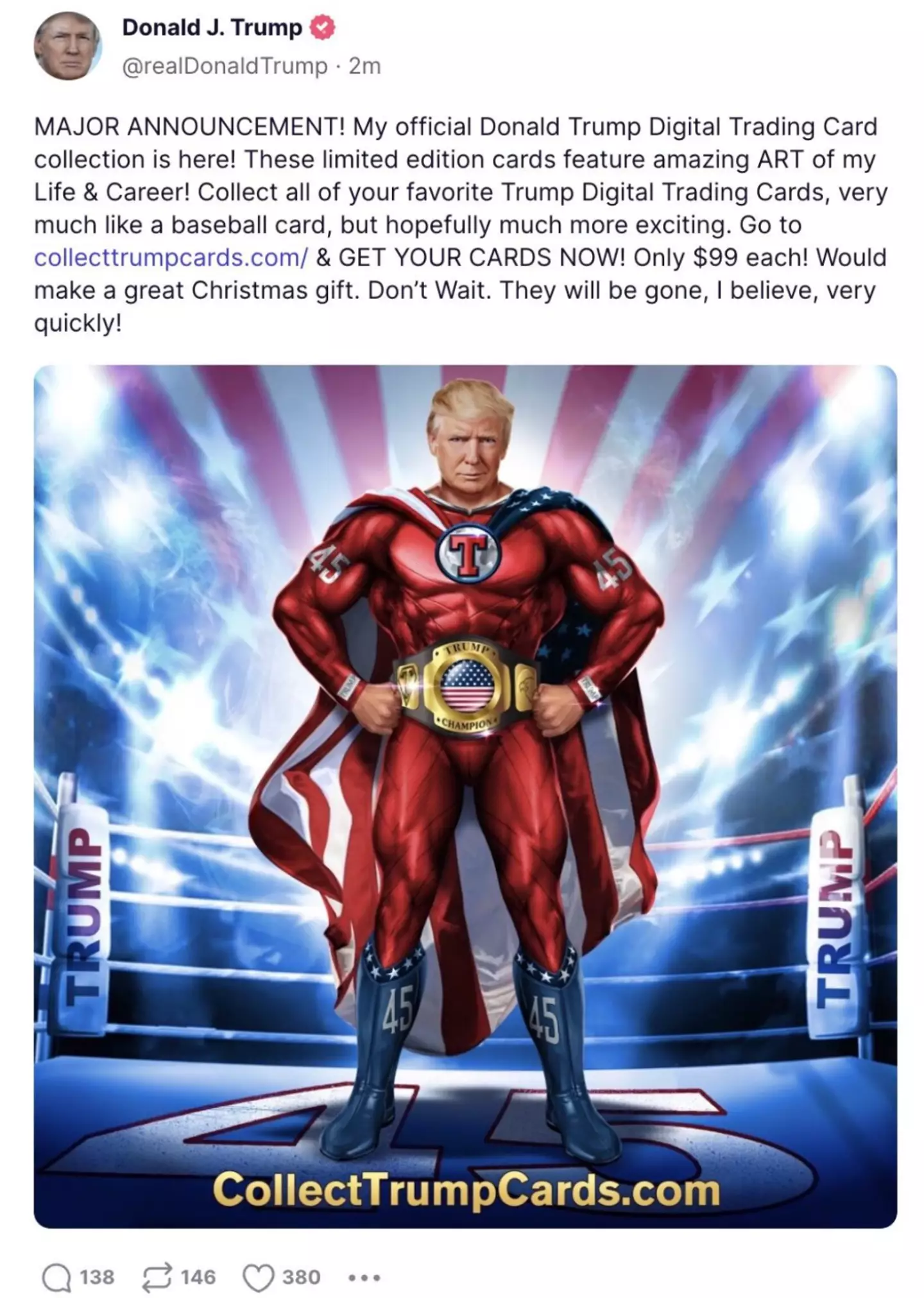 "Go to collecttrumpcards.com/ & GET YOUR CARDS NOW! Only $99 each! Would make a great Christmas gift. Don’t Wait. They will be gone, I believe, very quickly!"
