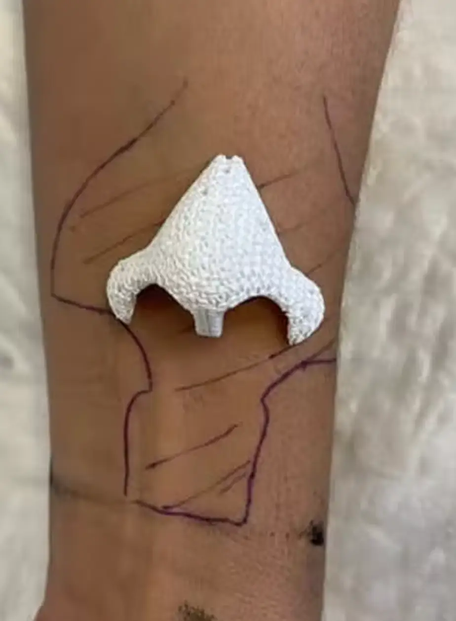 But in an impressive feat of medical science, medics were able to create a custom-made nose using 3D-printed biomaterial - in place of cartilage - and kept it on ice until the technology was advanced enough to transplant it onto the patient.