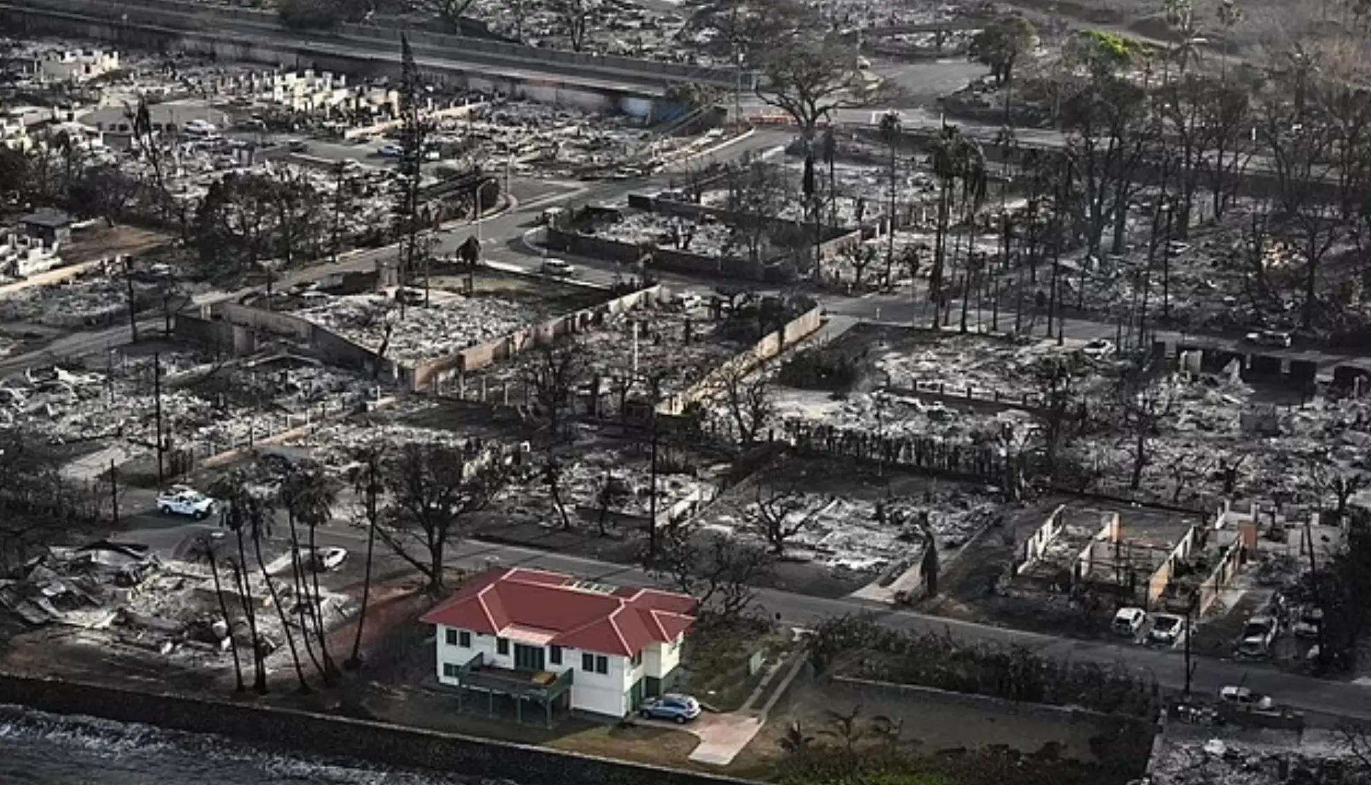 Aerial photos show that Dora Atwater Millikin and her husband, Dudley Long Millikin III's house, has been left in pristine condition despite all of its surroundings being burnt to a crisp in the historic Hawaiian town.