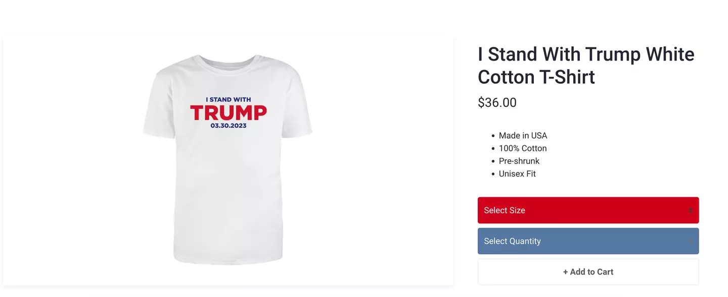 Additionally, an ‘I Stand With Trump’ t-shirt is available with the date ‘3/30/23’ placed underneath.