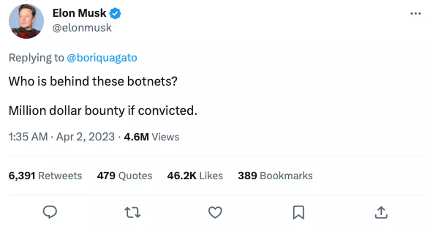 Musk then responded to the tweet: "Who is behind these botnets? Million dollar bounty if convicted."