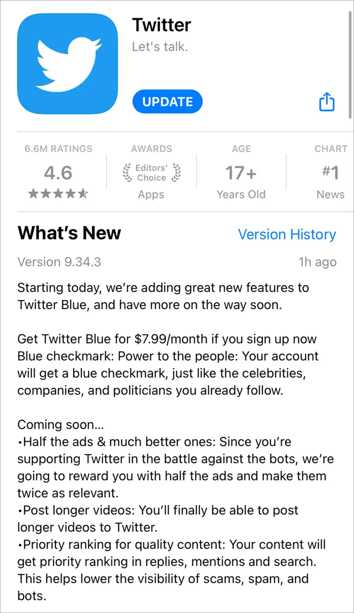 In a statement, Twitter said: “Starting today, we're adding great new features to Twitter Blue, and have more on the way soon. Get Twitter Blue for $7.99/month if you sign up now.