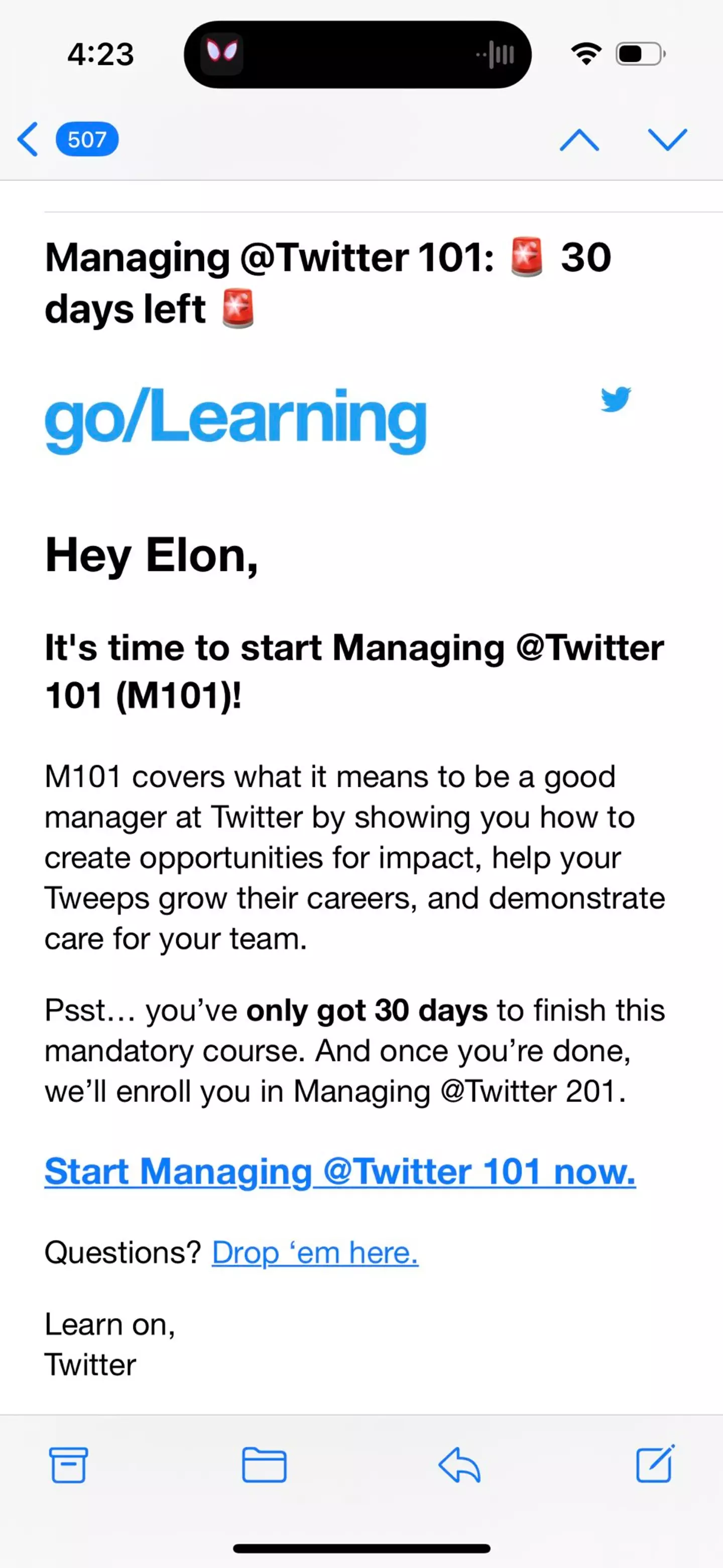 “Psst… you’ve only got 30 days to finish this mandatory course. And once you’re done, we’ll enroll you in Managing @Twitter 201.”