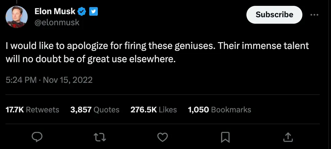 "Their immense talent will no doubt be of great use elsewhere," Musk continued in his tweet from November 2022.