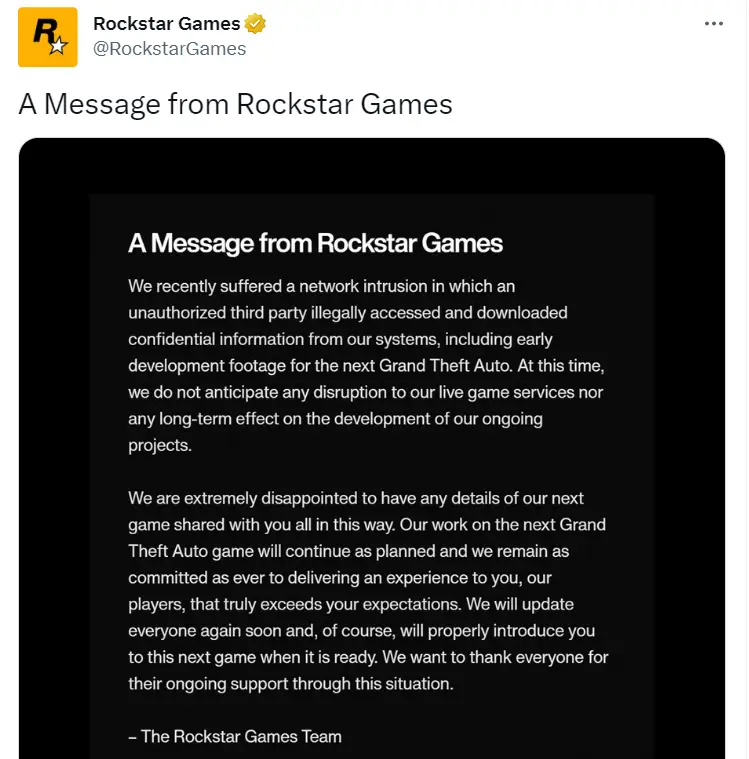 “We are extremely disappointed to have any details of our next game shared with you all in this way. Our work on the next Grand Theft Auto game will continue as planned and we remain as committed as ever to delivering an experience to you, our players, that truly exceeds your expectation.
